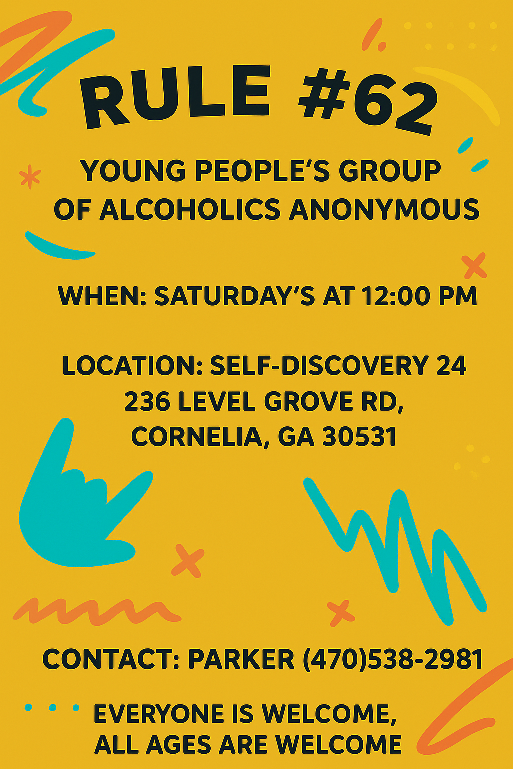 - NEW MEETING: Rule #62 Group (Saturdays @ 12pm Noon in Cornelia, GA) - See Brochure